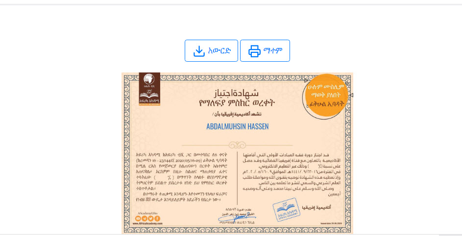 يتاح للطالب أو المتدرب الطابعة بدقة عالية أو تنزيل الشهادة